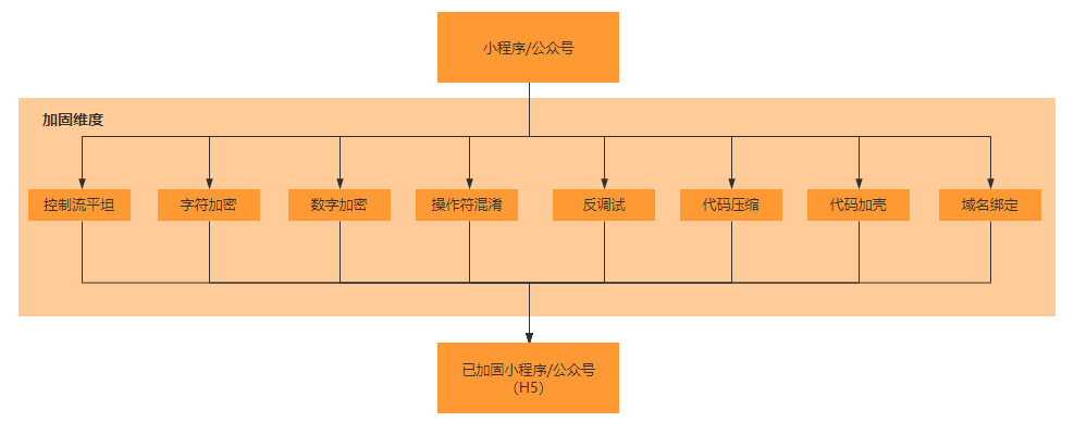 为移动应用中轻应用代码提供多方位加固方案,提高移动轻应用自我防御能力,防止应用被恶意攻击