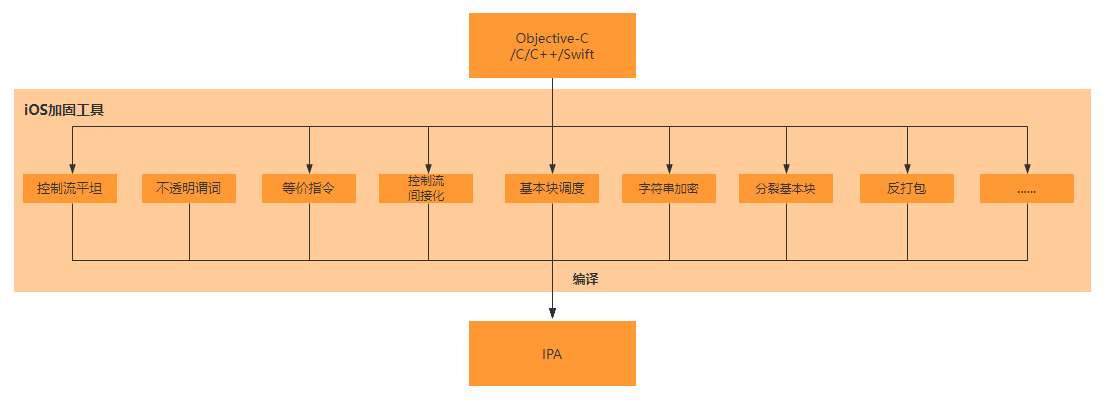 对C/C++/Objective-C代码中函数所对应的基本块进行“分裂”变扁,使其在常用反编译工具中,增加破解者分析难度,有效的保护核心算法的原始逻辑
